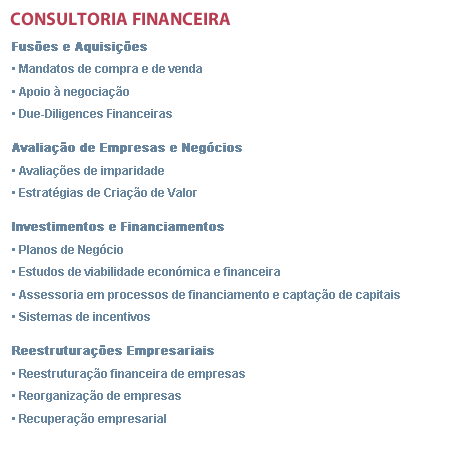Na Consultoria Financeira a JNB apoia os clientes em projectos especiais como fusões e aquisições, avaliação de empresas e partes sociais, projectos de investimento e reestruturações.